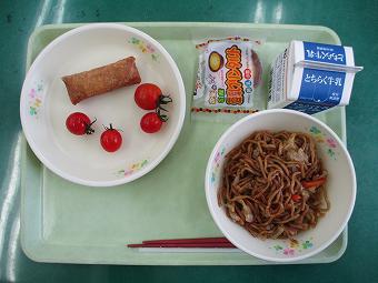 給食は、焼きそば、春巻き、ミニトマト、豆乳プリンタルト、牛乳でした。