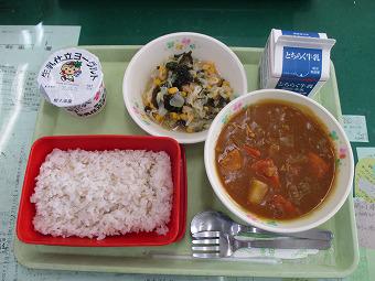今日の給食は、麦ご飯、牛乳、チキンカレー、海藻サラダ、ヨーグルトです。