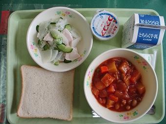 給食は食パン、キャラメルパテ、ハムと大根のサラダ、チリコンカン、ヨーグルト、牛乳でした。