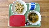 2学期初め、本日の給食の献立は、ご飯、牛乳、セルフ三色丼の具(枝豆)、じゃがいものみそ汁です。