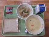 本日の給食の献立は食パン、牛乳、チルドチョコ、ごぼうサラダ、コーンクリームシチューです。