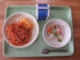 本日の給食は、デザートのセレクト給食です。さつまいものタルトかりんごのタルトから選びます。献立はスパゲティナポリタン、牛乳、オムレツ、カリコリサラダ、タルト(りんごかさつまいも)です。