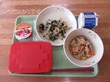 本日の給食の献立は、ご飯、牛乳、親子煮、おかかあえ、アセロラゼリーです。