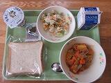 給食の献立は、県産小麦食パン、牛乳、とちおとめジャム、インド煮、かんぴょう入りサラダ、県産ヨーグルトです。