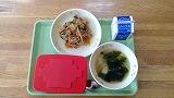 本日の給食の献立は、ごはん、牛乳、豚キムチ丼の具、わかめスープです。