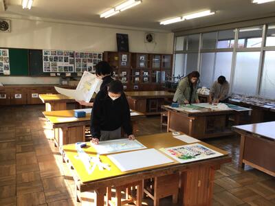 絵画コンクールや美術展覧会への出品が迫ってまいりました。今日は版画や絵画など図画工作作品の出展準備のため、7名のボランティアの方にご協力いただきました。子どもたちの作品がきれいに台紙に貼られ、出展の準備が整いました。本当にありがとうございました。