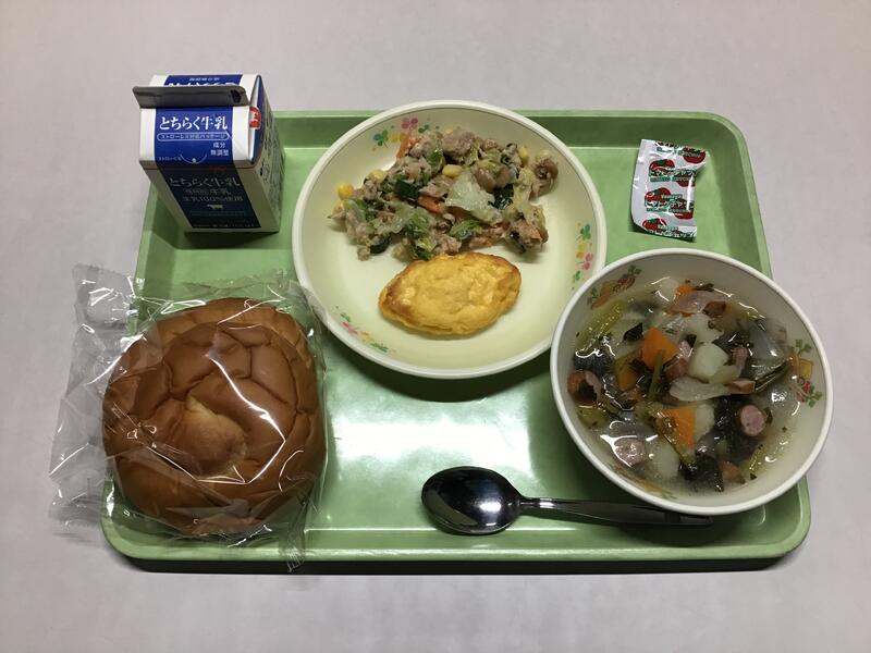 はちみつパン 牛乳 オムレツ ツナとだいずのサラダ ゴロゴロやさいのスープ
