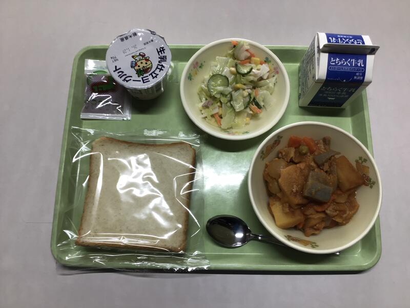 (6年生)けんさんこむぎしょくパン、牛乳、インドにがおいしかったです。完食しました。