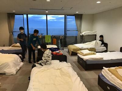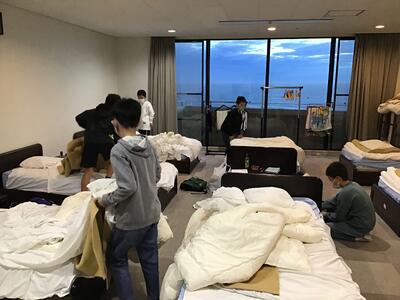 とちぎ海浜自然の家に着きました。施設の先生から、生活のルールや施設の使い方などを教えていただきました。部屋に入ってからベットメイキングをしています。