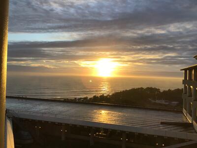 オリエンテーリングが終わった後、フリータイムの時間に展望デッキに行きました。海全体を見渡せるデッキで、みんなで記念写真です。