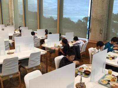 朝食の時間です。海浜自然の家の食事は、とても美味しいです。1日体力が持つように、おなかいっぱい食べました。
