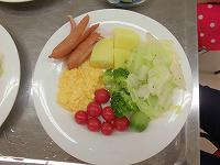 朝食は、サラダ、パン、ウインナー、ベーコン、ゆで卵、ヨーグルト、リンゴジュース、オレンジジュース、牛乳などでした。