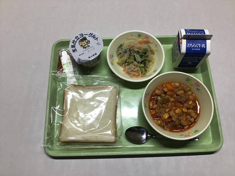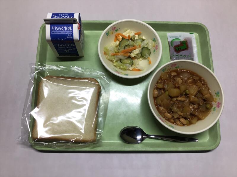 しょくパン とちあいかジャム ぎゅうにゅう チリコンカン チーズサラダ