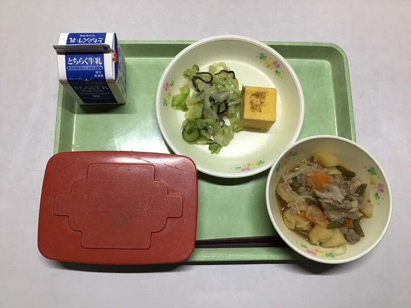 えんジョイランチ(てきえんこんだて) ごはん ぎゅうにゅう とちまるくんのたまごやき しおこんぶあえ にくじゃが