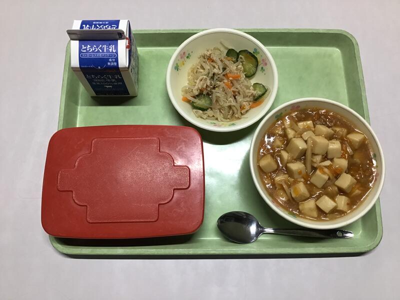 ごはん ぎゅうにゅう マーボーどうふ バンバンジーサラダ