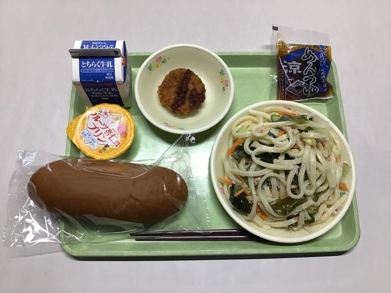 げんりょうくろパン ぎゅうにゅう ミンチカツ サラダうどん あんにんプリン