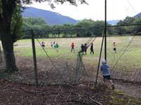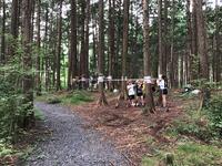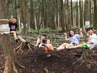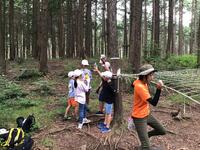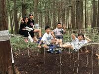 宿泊学習2日目の午前中の活動は、秘密基地づくりです。始めに基地づくりに必要な「ひばり結び」という特別な結び方を学びます。子どもたちはすぐに結び方をマスターしていよいよ森の中へ。4本の木に太いロープを結んで作った四角形にひもを使って頑丈な網を編んでいきます。大変難しい作業ですが、子どもたちは友達と声をかけ合いながら粘り強く取り組みました。出来上がった基地の上に乗り、木の揺れる様子を感じたり、揺らしてスリルを味わったりと楽しい時間を過ごしました。