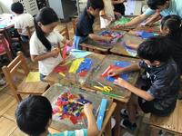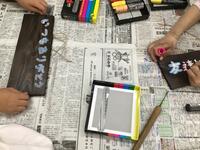 2日目、午後の活動は、杉板焼づくり、森のフォトフレームづくりです。板を焼いて、すすを落とし、きれいに磨くと木の模様が浮かび上がります。杉板焼はそれに文字を書きます。子どもたちは、カラフルに仕上げようと頭をひねりながら活動していました。森のフォトフレームは、木にドングリ、柊の葉、小枝などをグルーガンという特殊な接着剤でつけていきます。子どもたちは、どんな組み合わせにしようかと、活動に没頭していました。