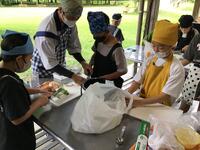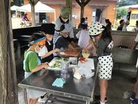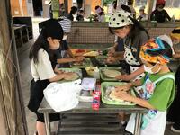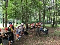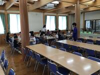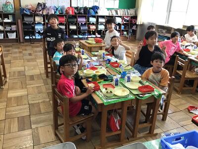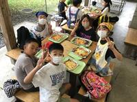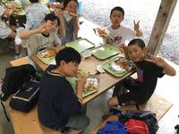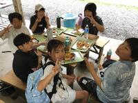 入所式とオリエンテーションの後は昼食です。メニューは、チキンカツ丼、マカロニサラダ、スープです。子どもたちは、しっかり食べ午後の活動に備えます。午後の活動は、明日の天気を考え、秘密基地づくりから、川遊びに変更しました。秘密基地づくりは、明日の午前中となります。