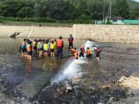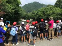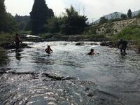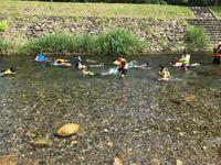 宿泊学習1日目の午後は、川遊びです。施設の方から川遊びのやり方や川遊びは大人やる事などの説明を受けてから、いよいよ川に入ります。始めはこわごわ川の中を歩いていましたが、数分後には、エンジン全開!歓声を上げながら流れに乗ったり、ゴーグルをつけて川の中をのぞいたり、思う存分楽しみました。休憩の後は全員で川を遡りました。川底のぬるぬるした石に苦戦しながらも、ペアで協力して取り組んでいました。小さい滝をよじ登ったり、深い場所をロープを掴んで渡ったりと日常では経験できない活動ができました。