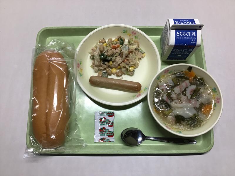 セルフドッグ(コッペパン) ぎゅうにゅう ソーセージ ツナとだいずのサラダ ワンタンスープ
