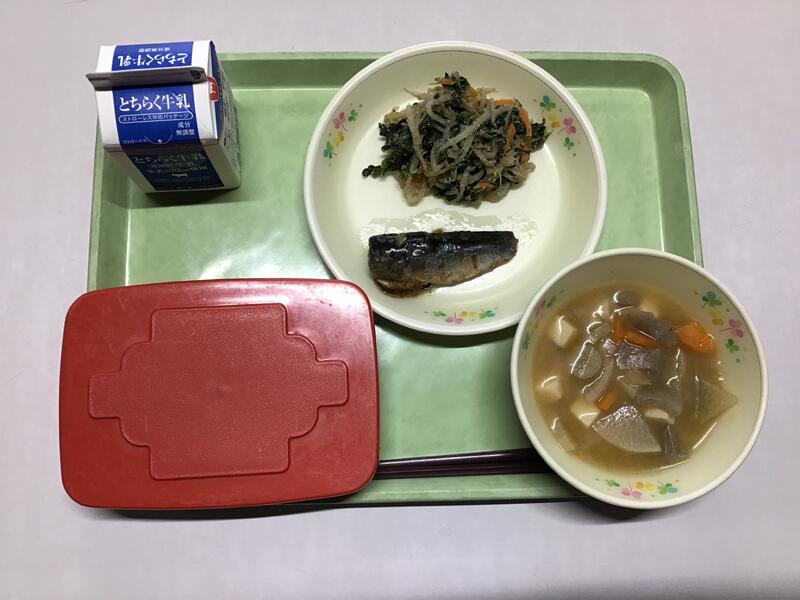 おさかなランチ  ぎゅうにゅう いわしのおかかに ごまあえ いなかじる