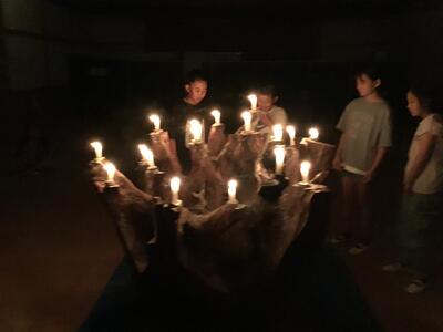 待ちに待ったキャンドルファイヤーをしました。晴れていればキャンプファイヤーのはずでしたが、室内でも4年生のみんなは十分に楽しんでいました。(画像は暗くて良いものが少なくてごめんなさい。)