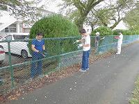 6:00頃から作業を始め、学校周りのフェンス周辺、校庭東の築山前、体育館入り口前、体育館西側通路、調理室前、北校舎北側、プール更衣室周り、鉄棒周辺・・・と1時間半に渡っての作業でした。