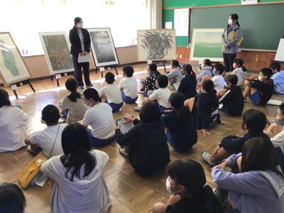 5日(金)には、美術館の相澤学芸員にお越しいただき、3年生から6年生を対象に鑑賞授業を行っていただきました。子供たちは、作品1点1点をよくみて、その中からお気に入りの作品を見つけて感想を書いていました。また、学芸員さんから「作品の『におい』や『音』『味』を感じてみましょう」といわれ、柔軟に、豊かに感性をはたらかせながら作品から様々なことを感じ取っていました。「時間が足りない」という声が聞こえてくるほどでした。