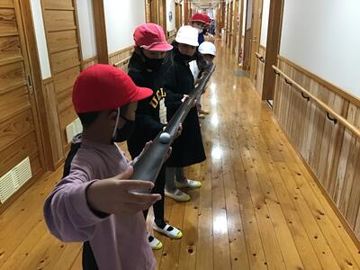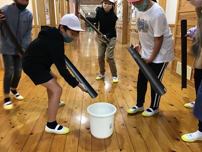 こちらは、ボールをつないで廊下の端にあるバケツに入れればミッションクリアです。これも、みんなの息を合わせる必要があります。