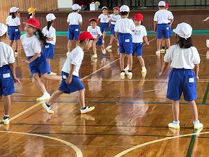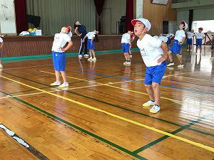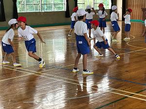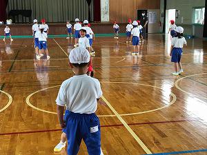 1校時、1年生は体育館での体育です。通常登校再開後1か月が過ぎようとしていますが、元気に準備運動をしています。学校生活に慣れたと感じました。白組と赤組に分かれて、白組の4名、3名、2名、最後の1名にジャンケンで勝ち進むゲームです。最後の1名までなかなかたどり着きません。楽しそうに活動していました。