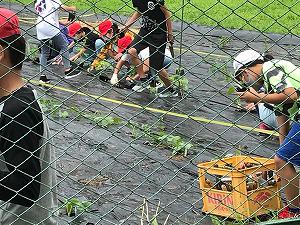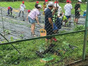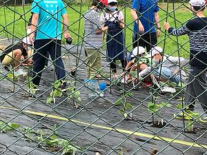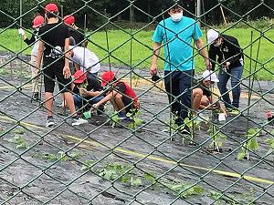6年生は、1校時に個々に選択した苗を植えました。キュウリ、ミニトマト、なす、おくらなどです。植えようとしたら、雨が降り出して体育館への一時避難後、雨がやんだので苗を植えることができました。手を汚しながら取り組んでいました。