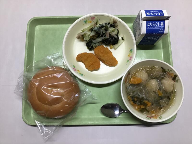 バターロールパン 牛乳 チキンナゲット ほうれんそうとコーンのソテー えびだんごスープ