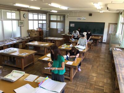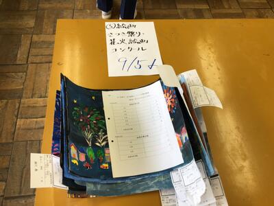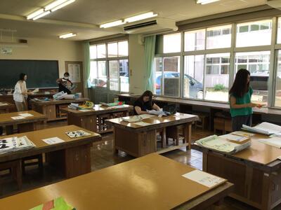 子どもたちの夏休みの作品がたくさん集まりました。この後各種コンクールに出展されるわけですが、ボランティアの方々が作品の整理をしてくださっています。担任の負担が軽くなり、とても助かっています。作業の様子をご紹介いたします。