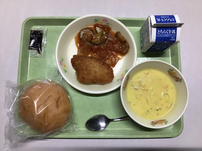 まるパン(スライス) 牛乳 しろみざかなフライ ラタトゥイユ コーンスープ