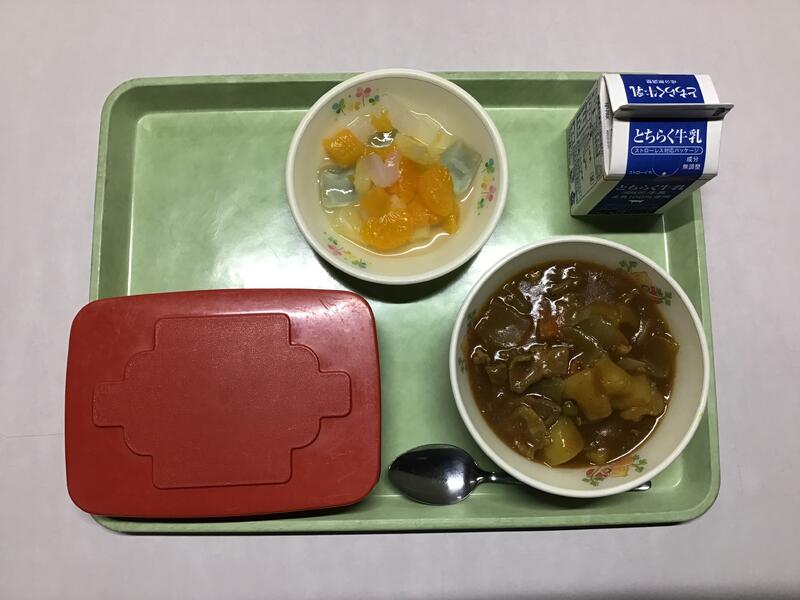 おおむぎごはん 牛乳 ポークカレー フルーツポンチ