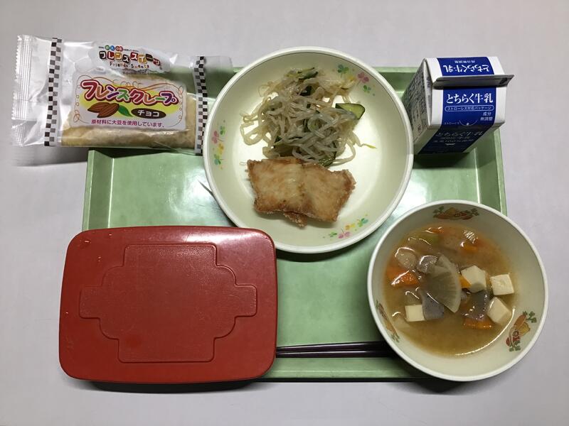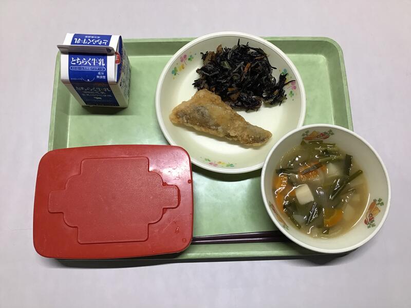 ごはん 牛乳 たらのコンソメたつたあげ いそに じゃがいものみそしる