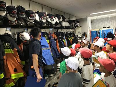 消防署では電話の仕方、消防士のお仕事、水そう車の仕組みなどを教えていただきました。