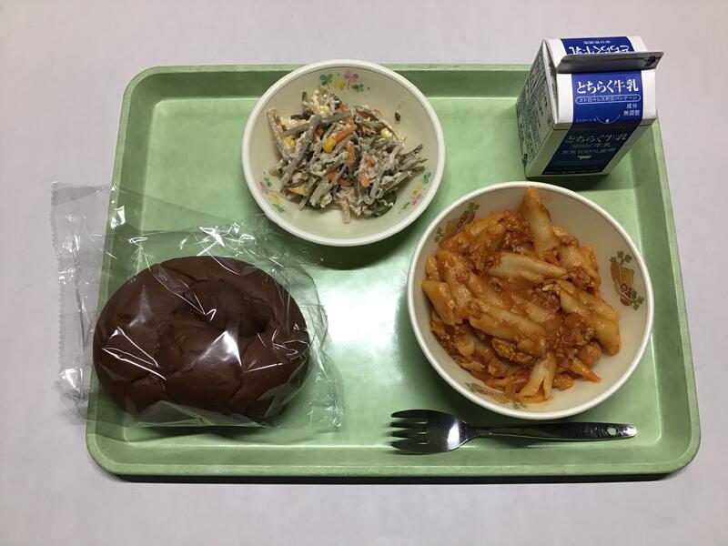 ココアロールパン 牛乳 ペンネマカロニのミートソースに チキンごぼうサラダ