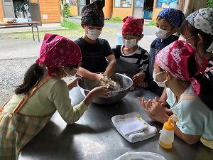 いよいよピザづくりです。生地づくりから始まりました。説明をしっかり聞いて始まりました。なかなか生地がまとまらなかったのですが、協力によってまとまりました。班での協力する姿がたくさん見られます。