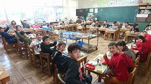 本日から、「在校生とのお別れ給食」が始まりました。これは、6年生を7つのグループに分け、それぞれ1年生から5年生の教室と職員室に行って給食を食べる活動です。