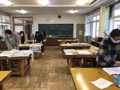 本日(1月13日)、作品整理ボランティアの皆さまが来校されました。美術展などに出品するたくさんの作品を、台紙に貼ったり、名前を記載するなどしてくださいました。子供たちが、時間をかけて一生懸命に制作した作品を、整理ボランティアの皆さまが1枚1枚丁寧に、心を込めて、出品準備に当たってくださっています。