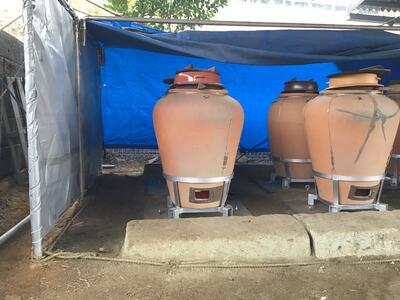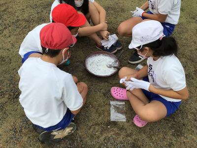午後の活動の「塩づくり」と「壺焼き芋」が始まりました。海に行って海水を汲み、火をおこして塩を作ります。焼き芋も無事に火をつけて壺に入れました。どちらも、後1時間以内には出来上がると思います。