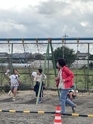 鬼ごっこやけいどろ、三本線など、元気に走り回っています。鬼ごっこ中に、カラーコーンに変身中の子供たちもいて、微笑ましい姿でした。職員も子供たちと一緒に走り回ったりブランコにのったりと、パワー全開でした。若いってすばらしいです。