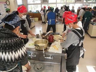 今回のお味噌汁の実は、西小で取れた大根に油揚げ、ねぎです。どのグループも協力しながら計量したり、お米をといだり、材料を切ったり手際よく進めました。今回は煮ぼしでだしをとり、調理室内にとてもいい薫りがただよいました。ガラス鍋でご飯を炊いたので、お米の変化や水分をよくチェックしながら進めました。