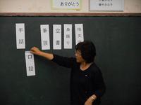 その後、ろう者とのコミュニケーション方法を考えました。手話・口を読む(口話)・身振りはすぐに子どもから出てきました。筆談・空書の二つは難しかったようです。みんな「なるほど!」と言っていました。