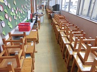 今週の清掃の時間に、子ども達と一緒に床の水拭きをして古いワックスをぬぐい取りました。そして今日、子ども達が廊下や通路に机と椅子を運び出して下校し、職員がワックスをかけて土日を挟むことになります。
