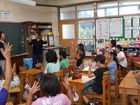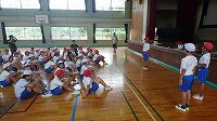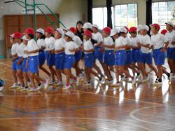 その後、体育館で、「フラフープリレー」や「お玉ボールリレー」で盛り上がりました。みんな大きな歓声を上げて、とてもうれしそうでした。最後に「じゃんけん列車」をやって、みんなで1列の列車になり、体育館を笑顔で一周しました。