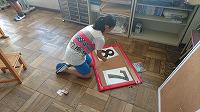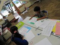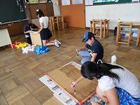 記録係は、運動会の各競技を点数にし、毎年全児童の熱い視線を集める得点を付ける係です。今年は、6年2名、5年1名、4年1名の4人で担当します。紅白のふちどりをし、花飾りをつくり、得点板をリニューアルしているところです。