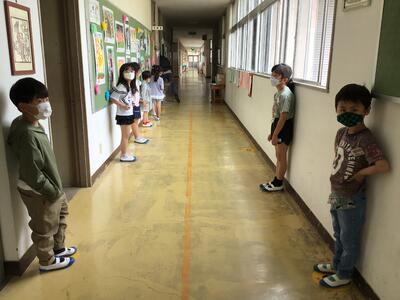 視力・聴力検査は、5月2日に上学年、5月6日に下学年を対象に行いました。保健室で聴力検査を受けた後、会議室で視力検査を受けました。密にならないようそれぞれの検査会場に入る人数を制限するため、子供たちは廊下で静かに順番を待ちます。子供たちの足元にある黄色い番号札、見えるでしょうか?